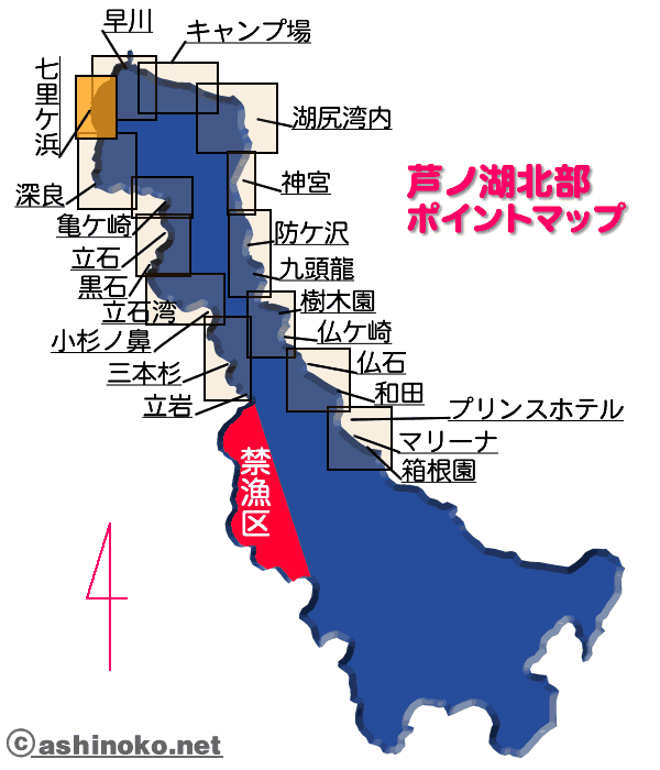 一見すると変化が無く、また岸釣りの人も多い為、ここを通り過ぎて深良方面へ移動する人が多いのが現状。 しかし、早川と深良の湖流の間にある為、意外に魚が付いている時があります。