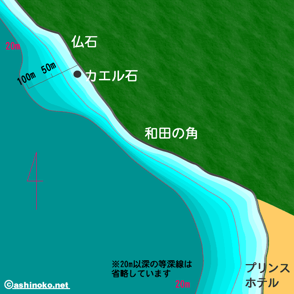 仏ケ崎を越えると、奥まった場所があります。この周囲だけ傾斜が緩やかな為、魚が良く集まります。ゴロタ石や岩も多く、良いストラクチャーを形成しています。